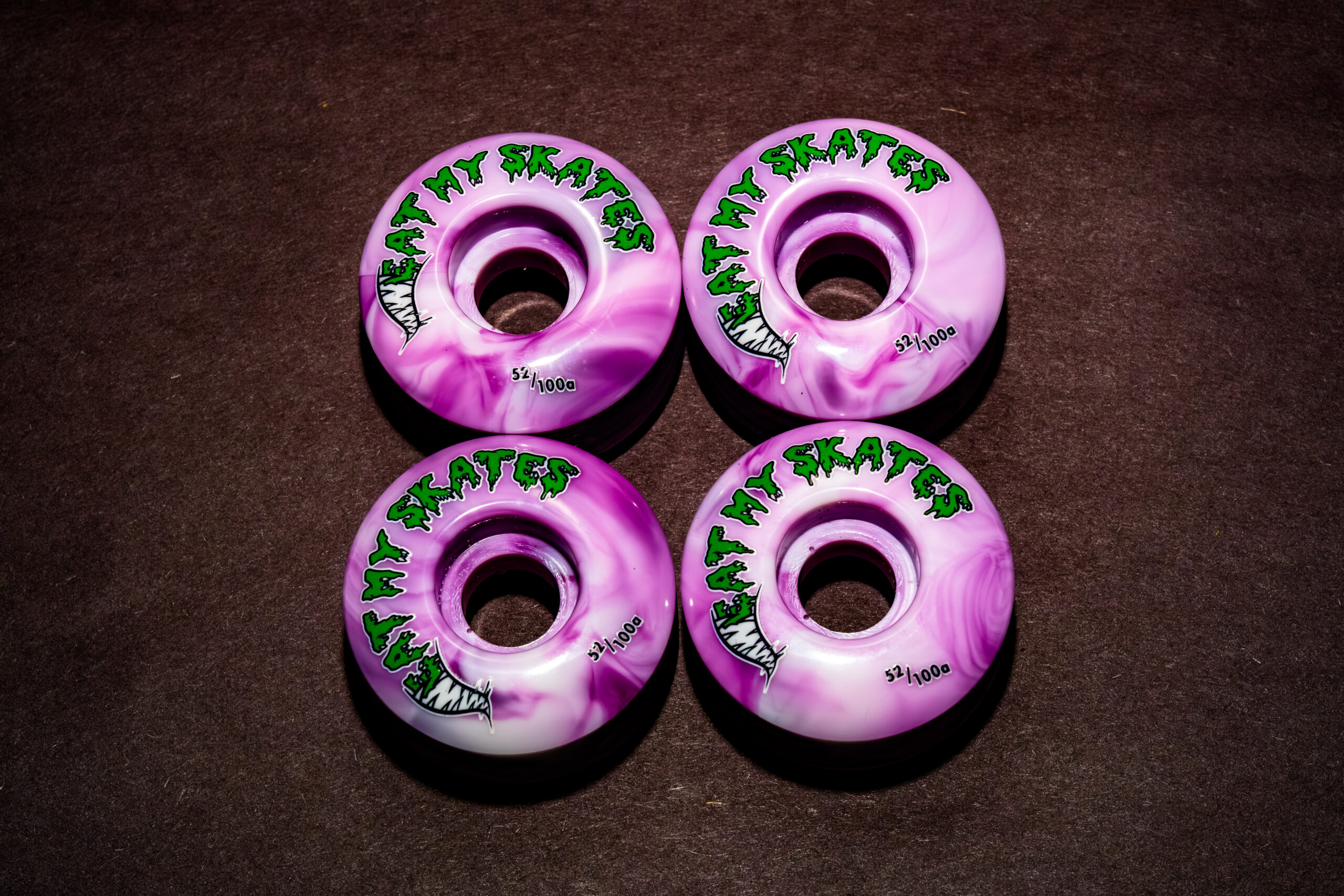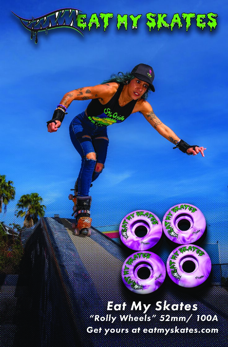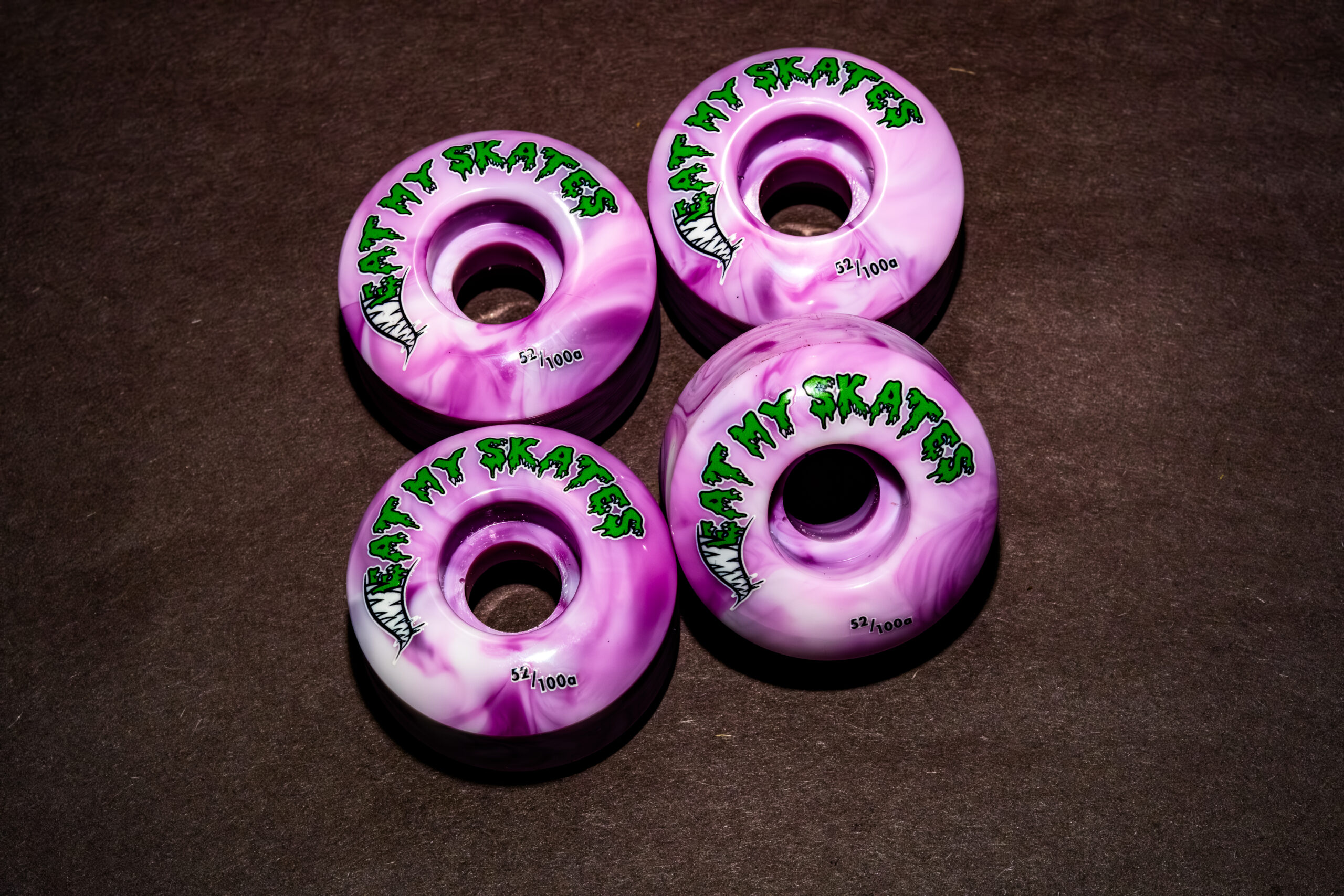 EXCITED for newly introduced signature Eat_MySkates “Rolly Wheels”. Ride through skate surfaces on 52m/ 100A.  Higher rebound for faster speeds over rough and smooth surfaces with a hard durometer for a smoother, faster ride that won’t mush out over time. Designed with an exclusive anti-stick compound that gives a fast/consistent, smooth slide all the way through.