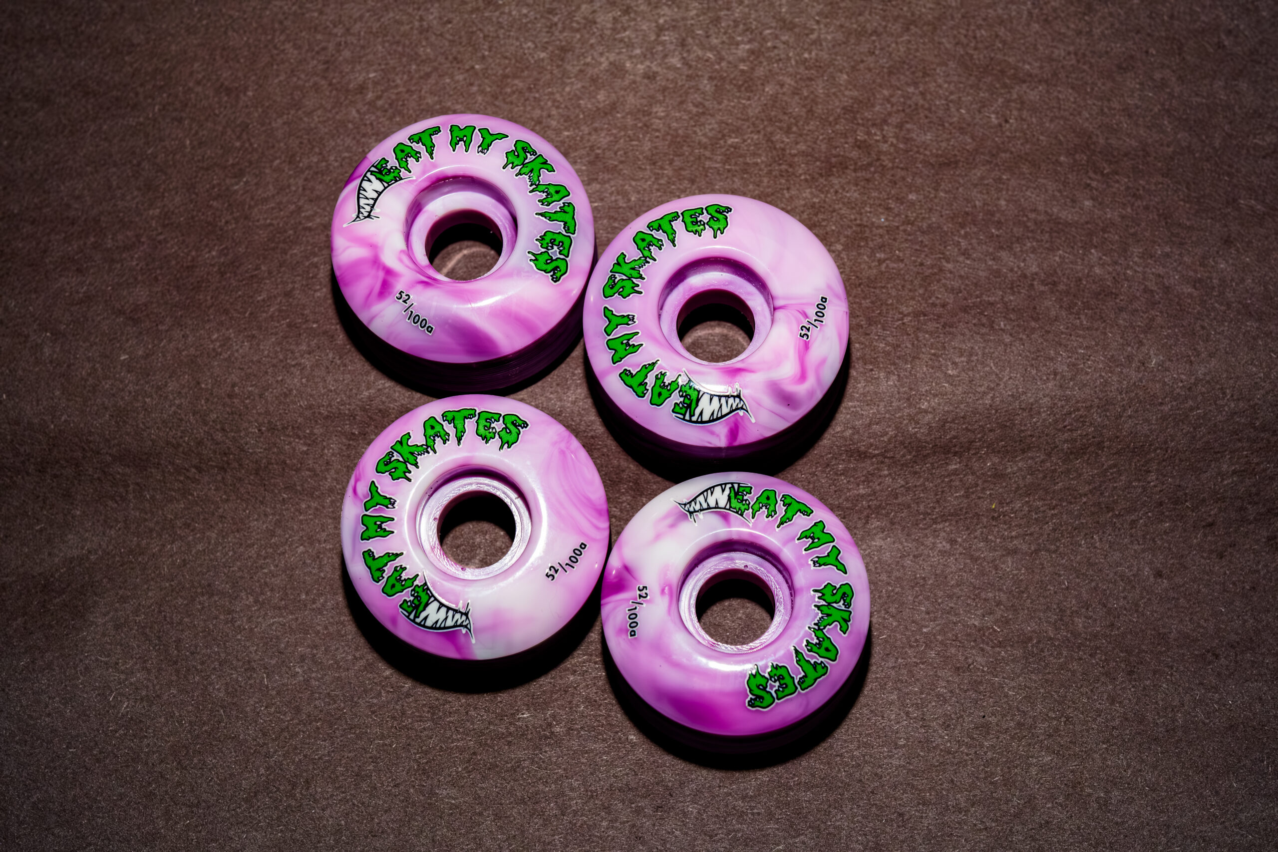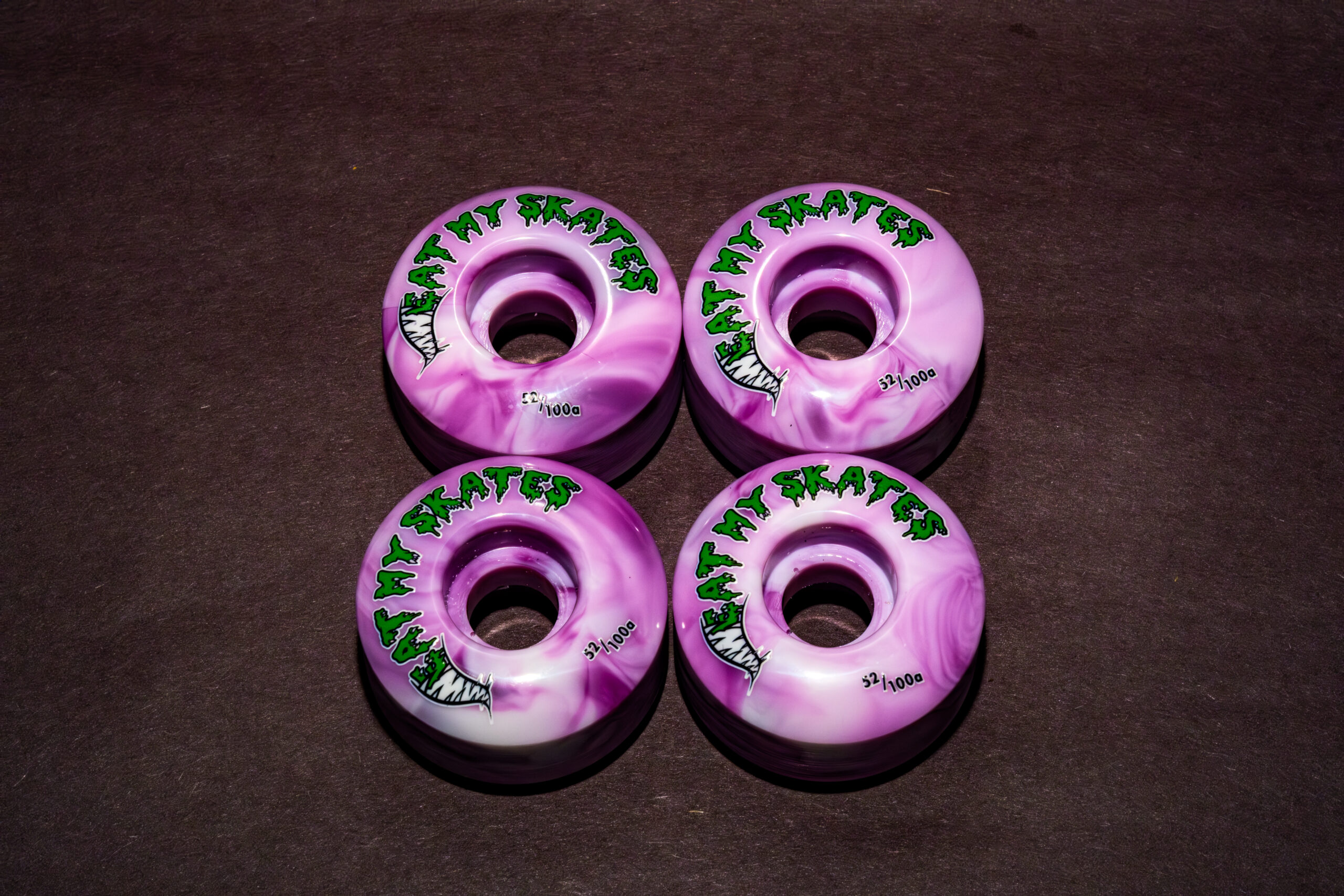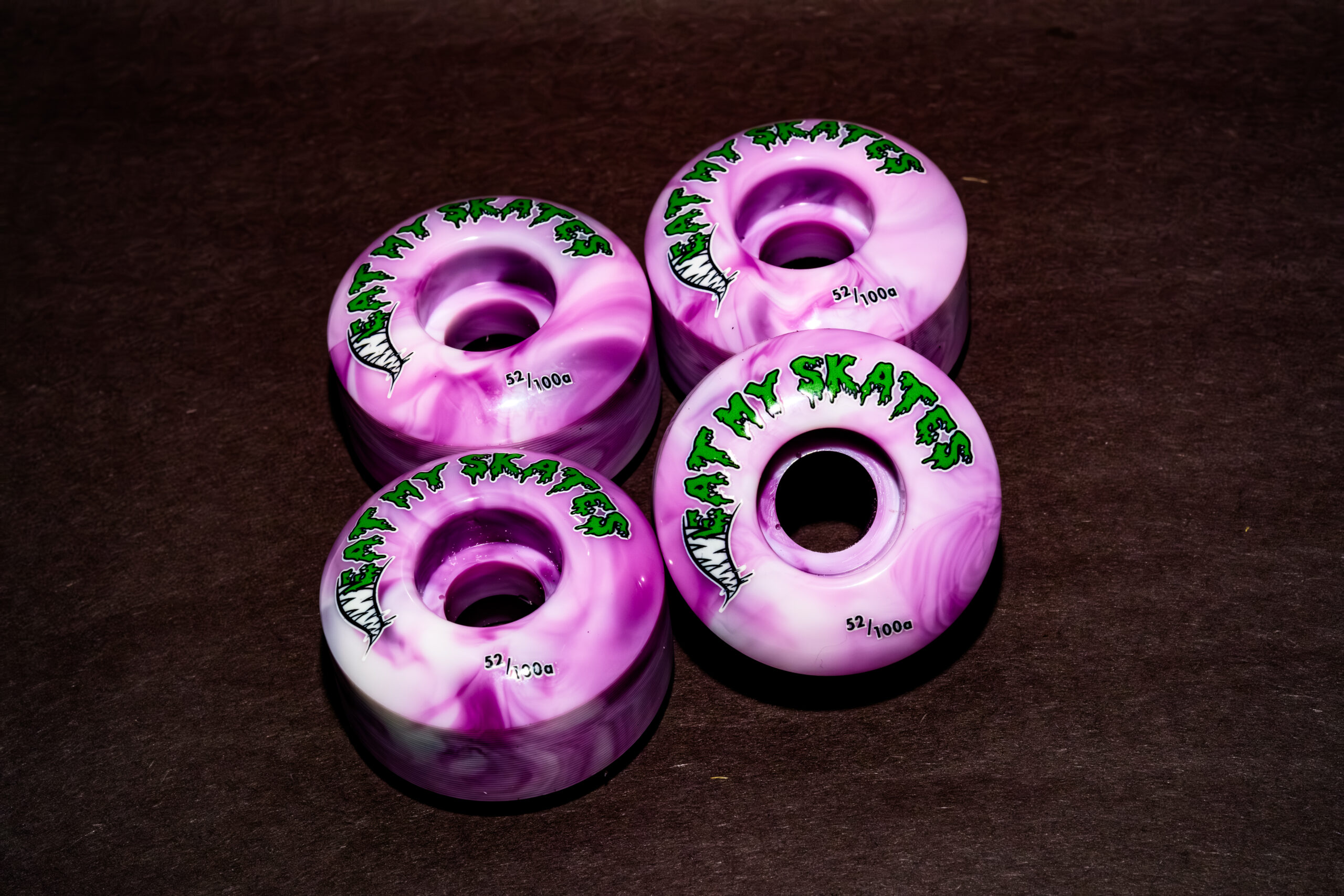 EXCITED for newly introduced signature Eat_MySkates “Rolly Wheels”. Ride through skate surfaces on 52m/ 100A.  Higher rebound for faster speeds over rough and smooth surfaces with a hard durometer for a smoother, faster ride that won’t mush out over time. Designed with an exclusive anti-stick compound that gives a fast/consistent, smooth slide all the way through.